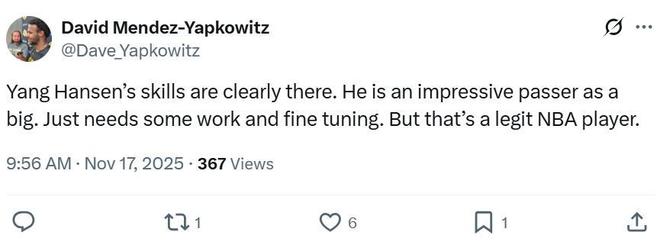 面对杨瀚森这样的表现,作为对手的湖人记者Dave Yapkowitz都不禁发文称赞:“杨瀚森的技术功底有目共睹,作为一名大个子,他的传球能力让人印象深刻,只需要经历打磨,他绝对是NBA级别球员。”