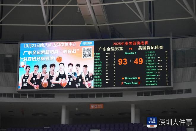 10月17日晚,2025中美男篮挑战赛在宝安体育馆举行,广东全运男篮以93比49的压倒性比分战胜了来自美国的肯尼哈奇男篮。比赛时间正值周五晚上,宝安体育馆内当晚涌入了近5000名球迷到场助威,呐喊声与鼓点交织成热血旋律。